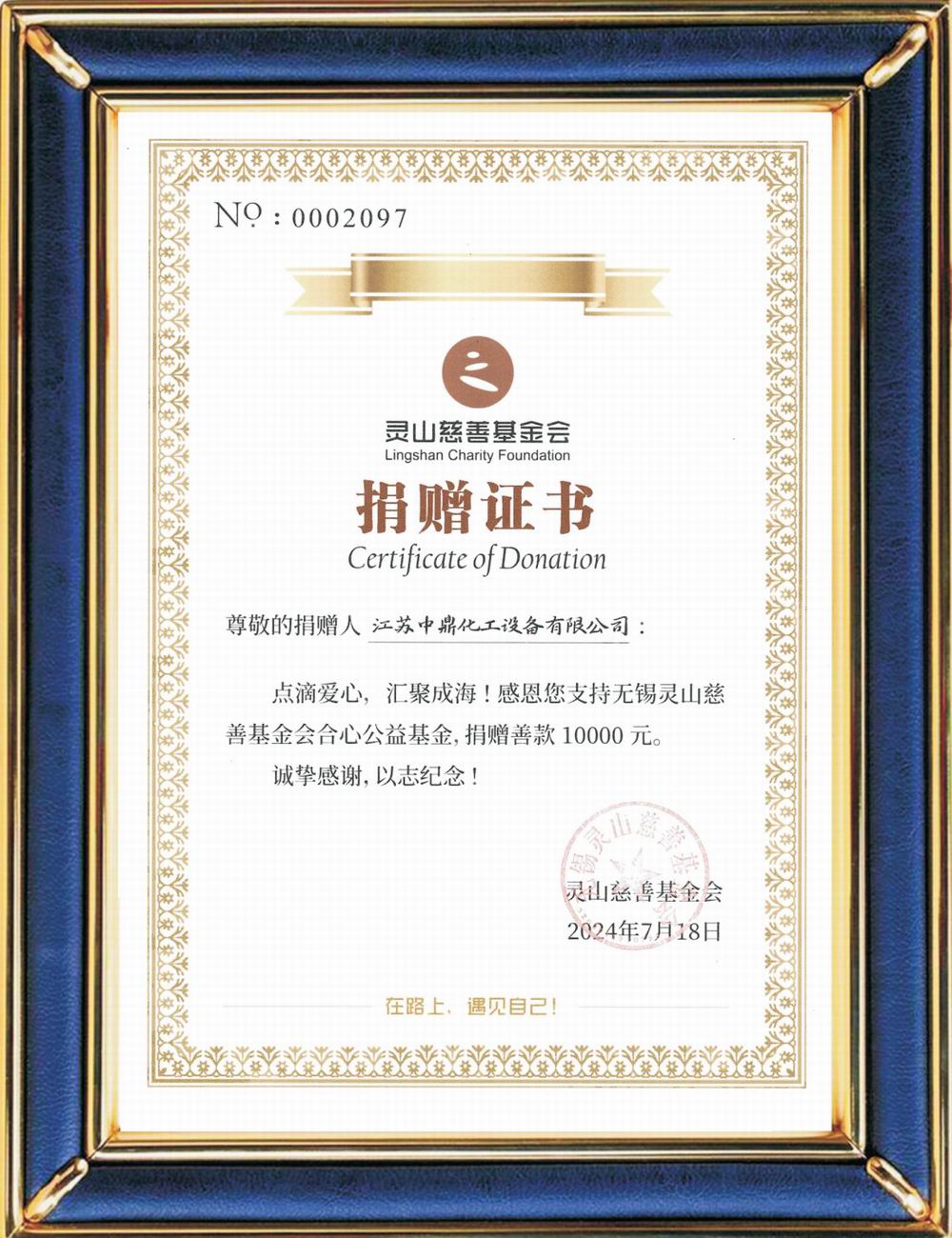靈山慈善基金會捐贈證書
