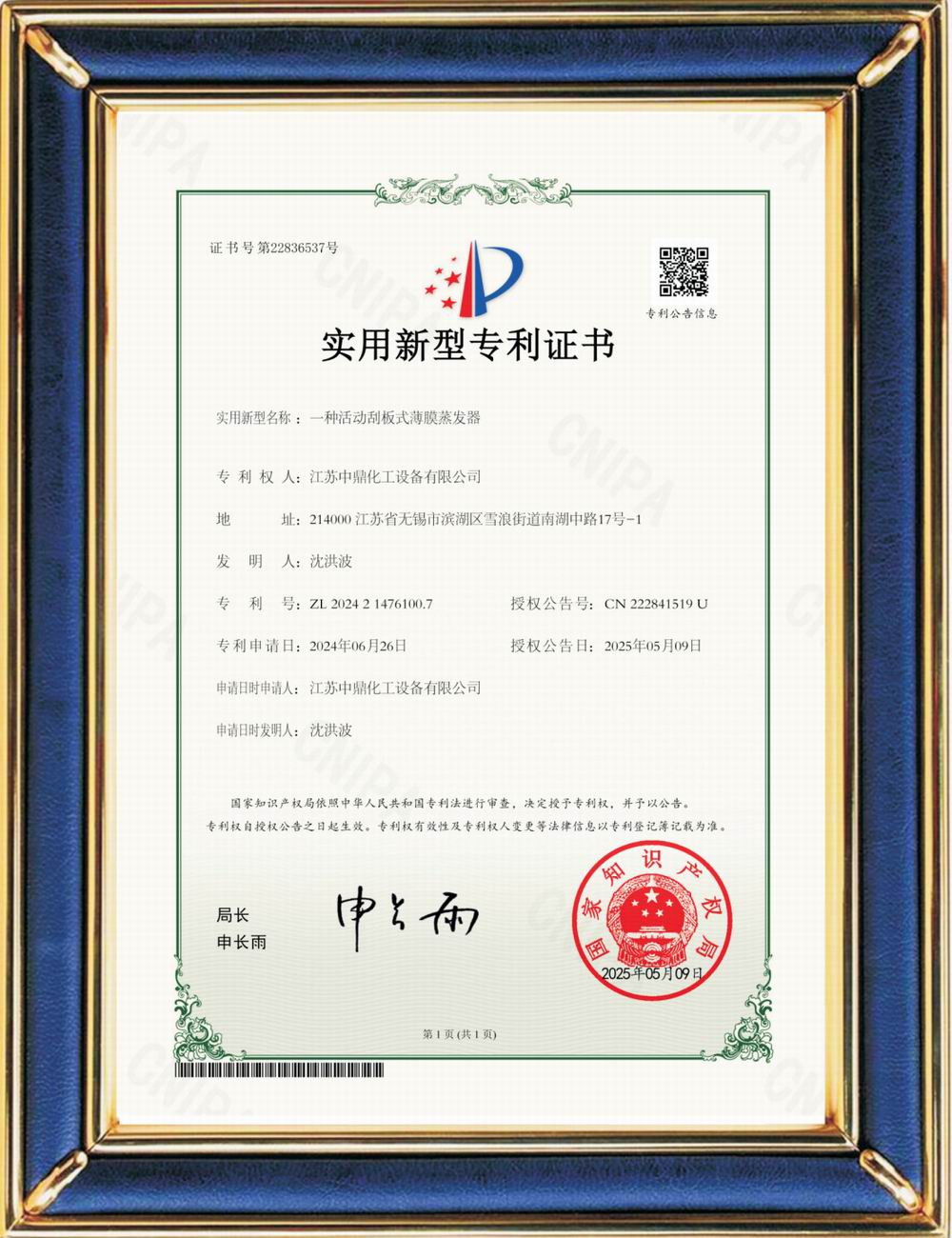 受理中實用專利通知書:鉸鏈刮板式薄膜蒸發器
