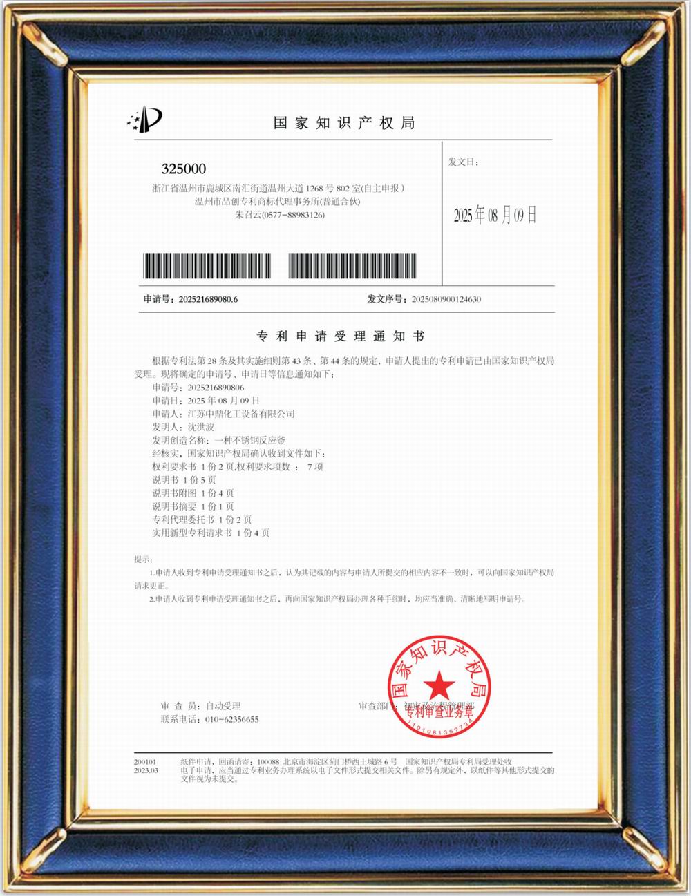 受理中實用專利通知書:一種不銹鋼反應釜