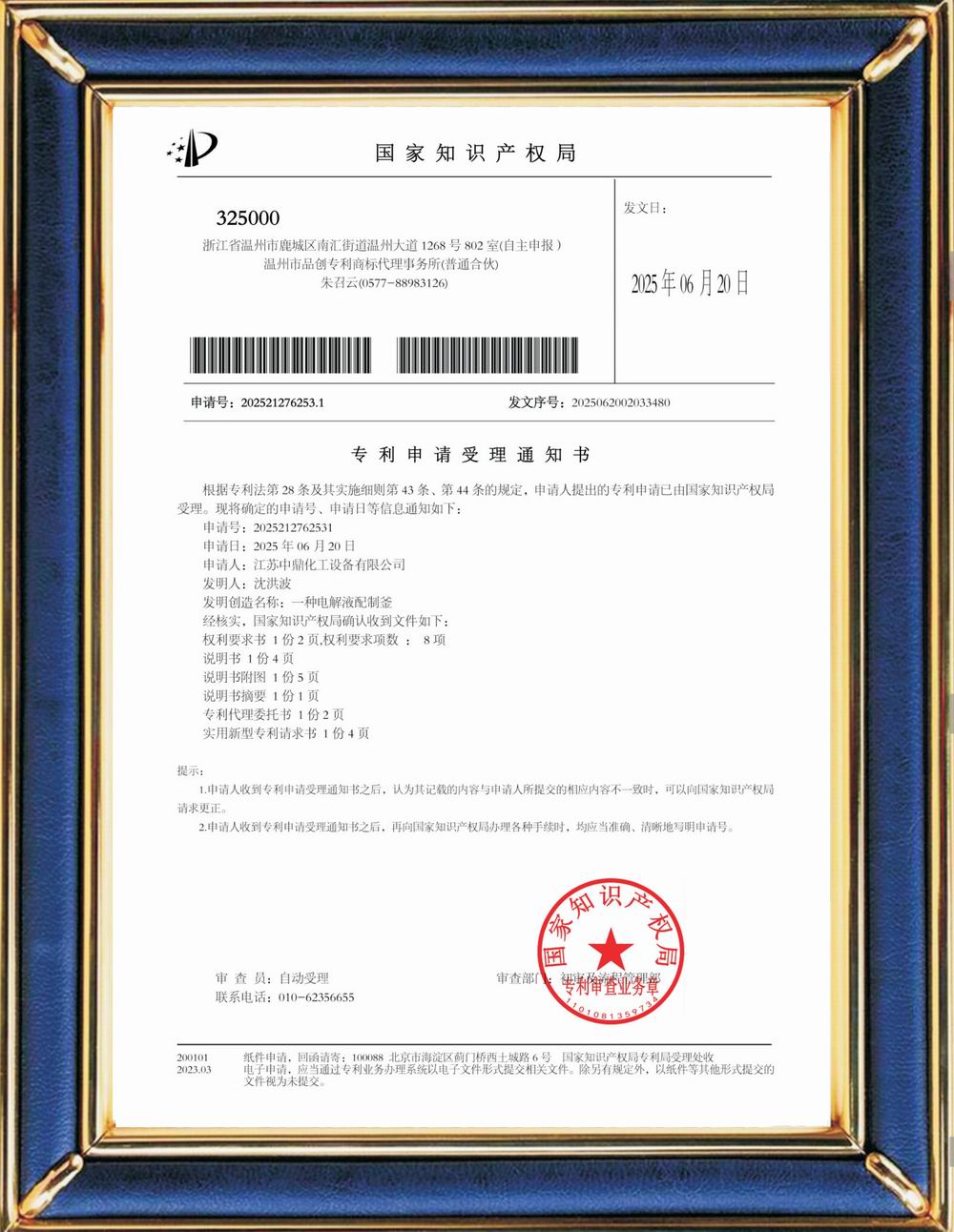 受理中實用專利通知書:電解液配制釜